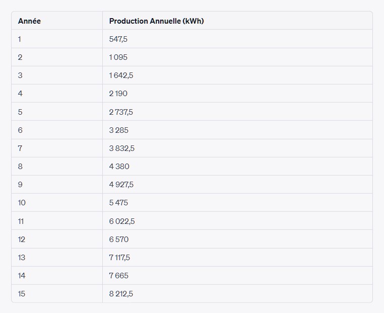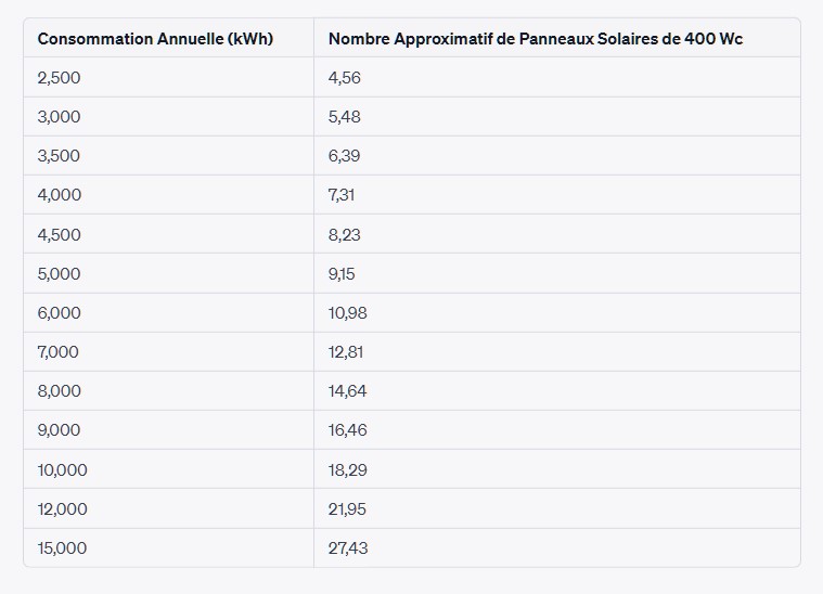 | Consommation annuelle (kWh) | Nombre de panneaux solaires estimés |