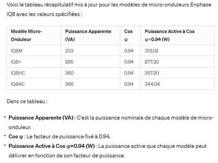 En résumé, avec un cos φ réglé à 0,94, votre micro-onduleur Enphase de 295 VA peut fournir jusqu'à environ 277,3 W de puissance active, ce qui est une utilisation efficace de la puissance électrique tout en étant légèrement inférieur à sa capacité maximale apparente.